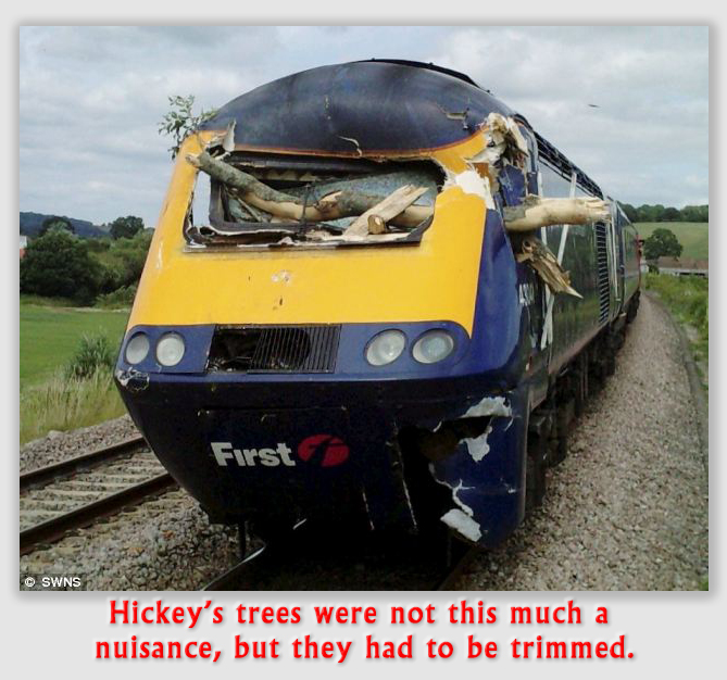 Hickey v. Michigan Central Railroad Co., 96 Mich. 498, 55 N.W. 989 (Mich. 1893). Mr. Hickey lived next to the Michigan Central right-of-way. Probably to wall off some of the noise and cinders, he planted trees along the boundary of the railroad right-of-way. The branches eventually overhung the right of way to such an extent that at times they brushed against the face of the engineer when his duties required him to lean out of his cab for the purpose of maintaining a lookout.