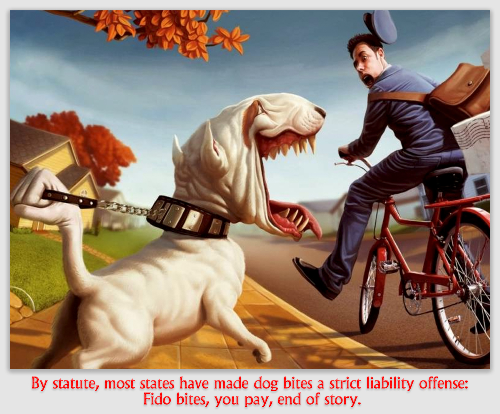 Never mind, Vic argued, Al should be responsible for what his trees might do regardless of whether he was negligent or not. The concept, strict liability – sometimes called liability without fault – has some utility. If you keep a couple of pet tigers in the backyard and a great white shark in the fishpond, the courts aren’t going to waste a lot wondering if you were negligent when the jungle cats maul the neighbor boy or the great white eats the president of the garden club when she leans over the water to admire the lilies. You do something that is inherently dangerous – keeping wild animals is not just a great example, but is the genesis of the notion of strict liability – was you’re going to be liable for whatever happens.