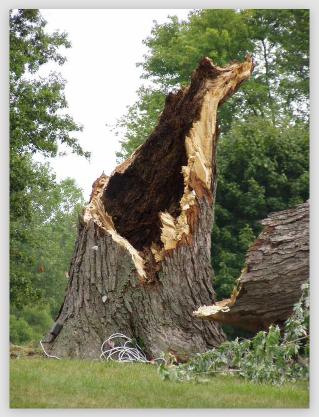 The storms that day caused extensive damage. Roughly eight whole trees were uprooted or broken off, and many others lost large limbs or parts of their trunks.