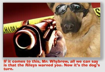 Now we’ll put up with a lot, but we won’t put up with that. You shouldn’t shoot a dog. (See this post for more details). The Rileys felt the same. They complained in winter 1999, but nothing changed. The police raided the place, but all they found was some personal-use marijuana. The Rileys complained to landlord Richard Whybrew again. The Attorney General complained to Mr. Whybrew. Nothing happened. Mr. Whybrew said the tenants were paying their rent, so he wasn’t going to do anything. Apparently, he believed that money talks but neighbors walk.