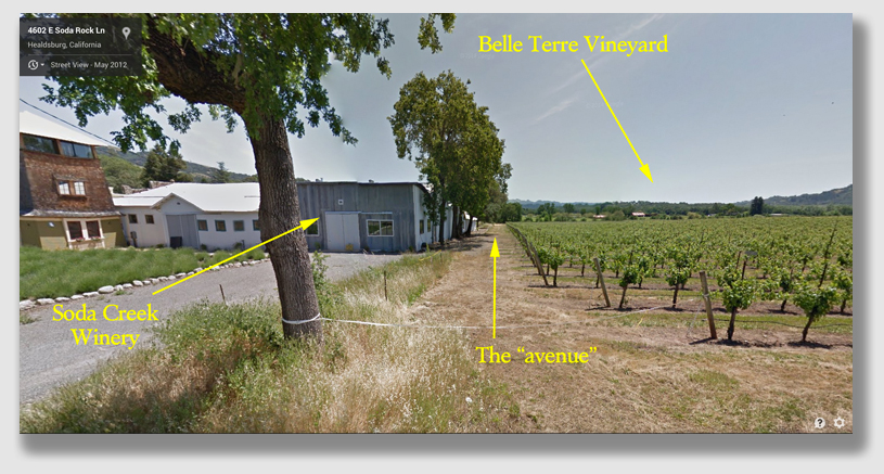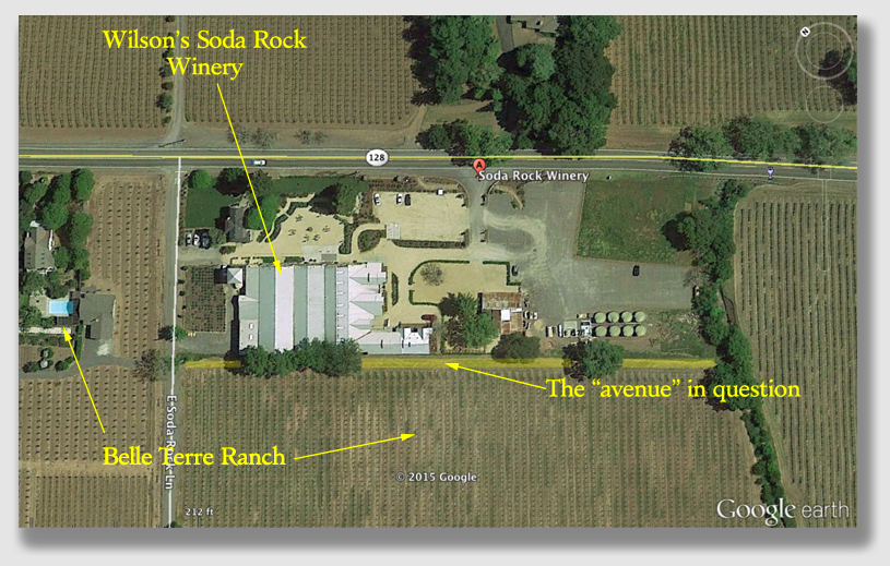 The rear of the winery building backs up to a vineyard belonging to Belle Terre Ranch, with a pathway or “avenue” between. A line of oak trees runs behind the winery within about four feet of the building. Thanks to the ubiquity of satellites (look up and smile!), we are able to easily understand the layout, and thus the nature of the Wilsons’ problem with the neighbors.
