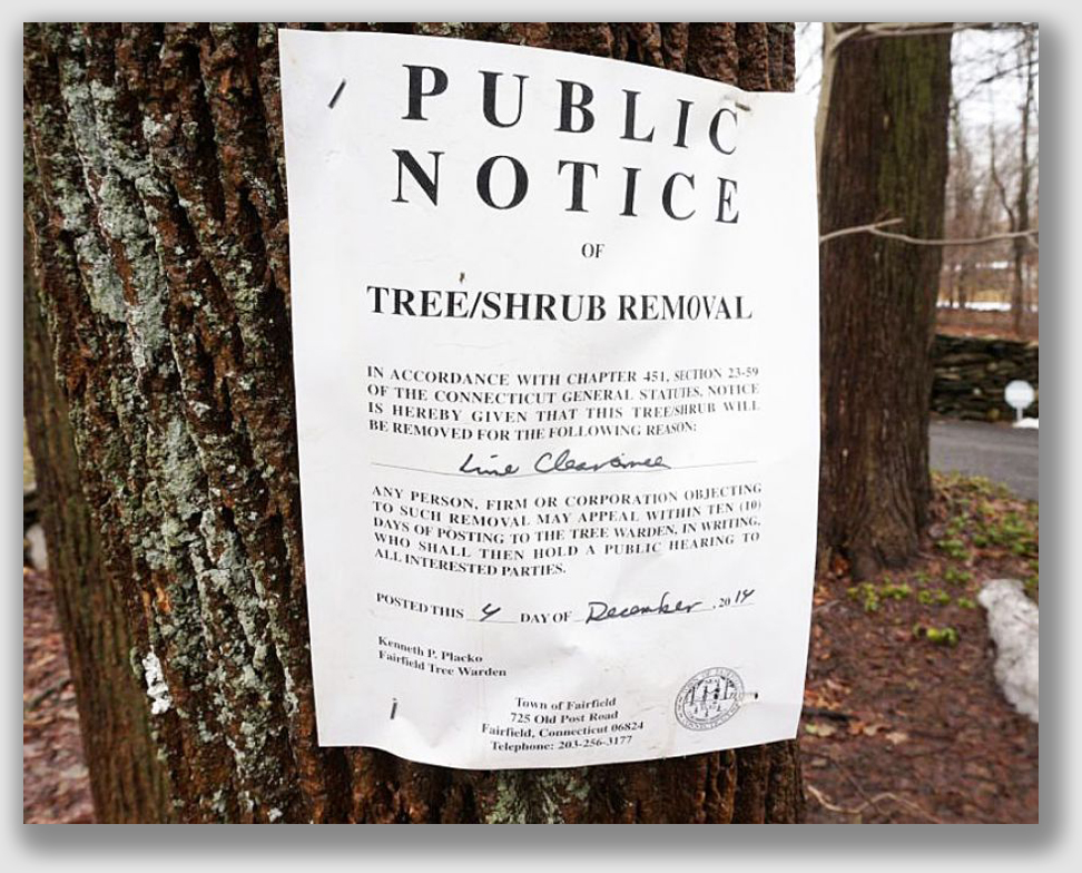 A Country Club Road resident is seeking monetary damages from the town and a halt to any further tree removal or pruning on her property following what her attorneys are calling the ill-conceived and illegal removal of limbs from a tree not located in the public right-of-way, according to a civil complaint. The owner of 259 Country Club Road also is seeking statutory damages (under a state law regarding tree removal) and reimbursement of legal costs after New Canaan’s tree warden later turned down her objection to planned tree removal of two trees in a denial that “was retaliatory in nature for the plaintiff’s reaction to the [tree warden’s] mistake and errors with respect to” the first tree, according to a complaint dated Feb. 8 and received Feb. 11 by the town. On Dec. 9, following an exchange between the homeowner and tree warden regarding the posting of the tree—it was to be removed at Eversource’s request because it threatened power lines, the town official said—the utility “began to cut the limbs off of Tree One without any hearing …”