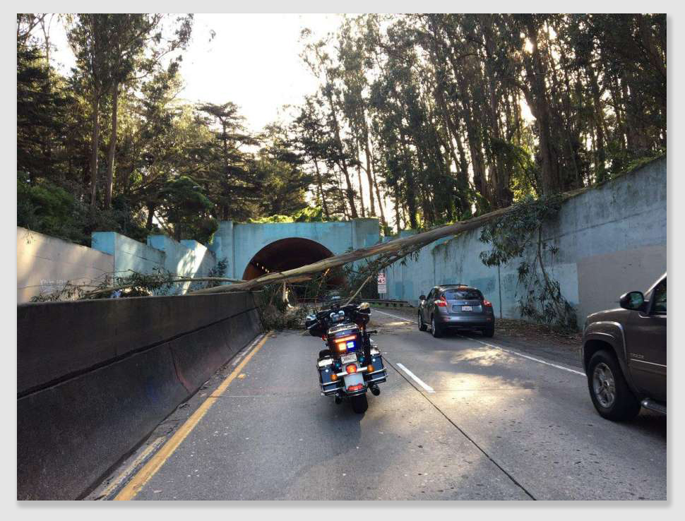 San Francisco, California, Chronicle, December 19, 2016: Gigantic tree blocks all lanes near MacArthur Tunnel